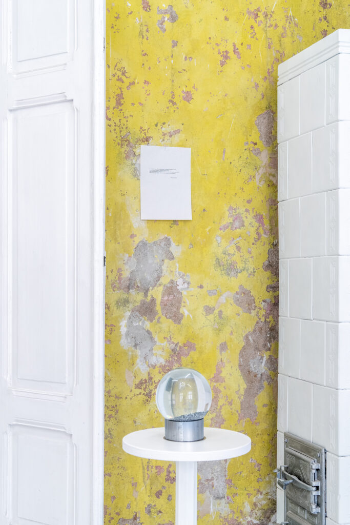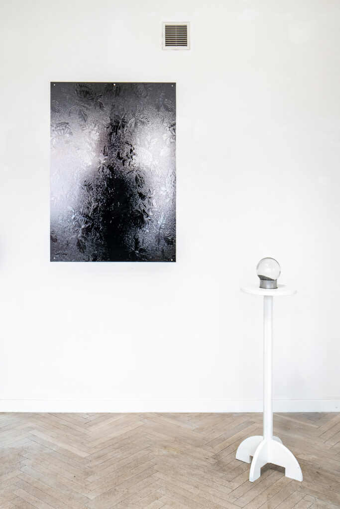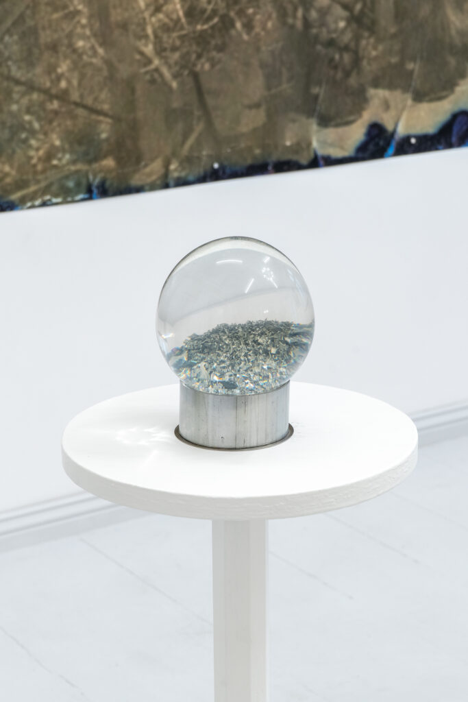 2018, obiekt: szklana kula o średnicy 12 cm wypełniona wiórami metalu zanurzonymi w cieczy, na podstawie ze stali.